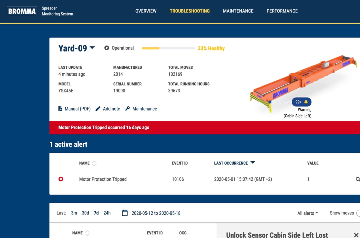 Bromma SMS is a modern, data-driven tool that can radically increase terminal efficiency, both in the short and long term. SMS helps spot declining spreader performance and other negative trends early and allows ports to address them before they become a problem - in real-time and without physical inspections. Longer spreader life cycles, optimal energy consumption, and less travel for maintenance all increase sustainability.